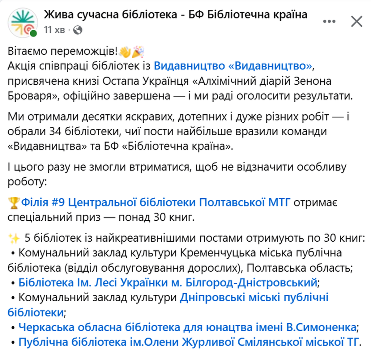Чудові новини! Наша бібліотека-філія №9 ЦБ Полтавської МТГ опинилась серед переможців конкурсу акції співпраці Видавництва «Видавництво» та Живої сучасної бібліотеки - БФ «Бібліотечна країна» і вже отримала спеціальний приз — понад 30 нових книжок!