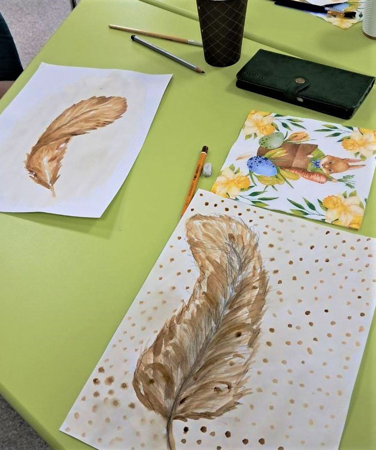 Щоб налаштуватися на хвилю натхнення, всі прослухали уривок з кантати Себастьяна Баха «Про каву». Тема ж заняття вималювалася з притчі про птаха Фенікса, який, попри згорання, повстає з попелу, тож кожен малював кавою перо свого власного птаха відродження. Цей символічний малюнок є показником того, що ми, попри складності, відновлюємося та продовжуємо боротьбу на шляху до власного щастя та загальної перемоги.