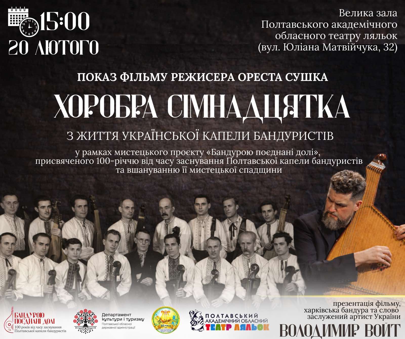 В рамках загальношкільного проєкту професійного розвитку педагогічної спільноти «В єдності – до ПЕРЕМОГИ», 20 лютого викладачі та учні відділу народних інструментів Полтавської міської школи мистецтв «Мала академія мистецтв» імені Раїси Кириченко долучилися до перегляду фільму режисера Orest Sushko «Хоробра сімнадцятка», що відбувся у Великій залі Полтавського академічного обласного театру ляльок.