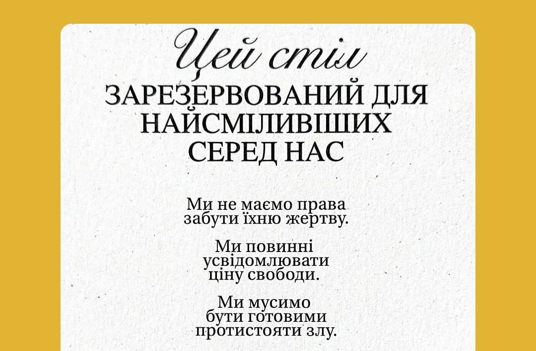29 серпня заклади по всій Україні перетворюються на місця пошани. У 2023-му це були сто ресторанів, у 2024-му – вже понад вісімсот закладів. У 2025-му акція вийшла за межі країни – «Стіл пам’яті» з’явився у бібліотеках, культурних центрах і військових інституціях від Японії до Північної Америки.