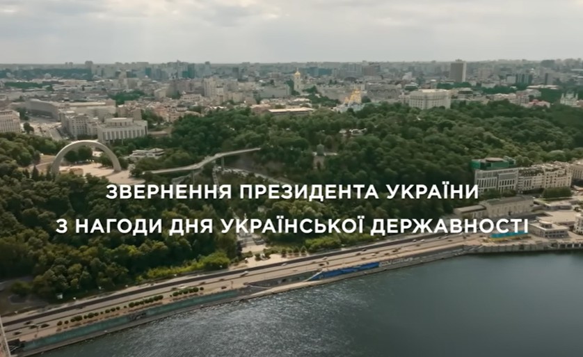 «День нашої державності. День хрещення Київської Русі – України. Цей день – про зв'язок. Про всі етапи нашого державотворення й те, що об’єднує десятки поколінь – тих, хто жив на цій землі тисячу років тому, і тих, хто живе зараз. Міст крізь часи, який стоїть на трьох нерушимих опорах: українці тут були, українці тут є, українці тут будуть. І завжди на цій землі перемагає життя, беруть гору цінності та наш характер. Найкраще в наших людях, які попри війну, сльози й біль зберегли в собі людину, бережуть один одного, а значить – бережуть свою державу. Я дякую вам. Мільйонам українців. Мільйонам характерів, із яких складається наша держава. Наш народ. Наша історія. І шлях від Хрещення Русі – України до сьогоднішнього дня. Дня нашої державності й того досвіду кожного покоління, який допомагає нам сьогодні триматись, вірити в себе, вірити в Україну, вірити, що ми зможемо!» Звернення Володимира Зеленського з нагоди Дня Української Державності – Дня хрещення Київської Русі-України.