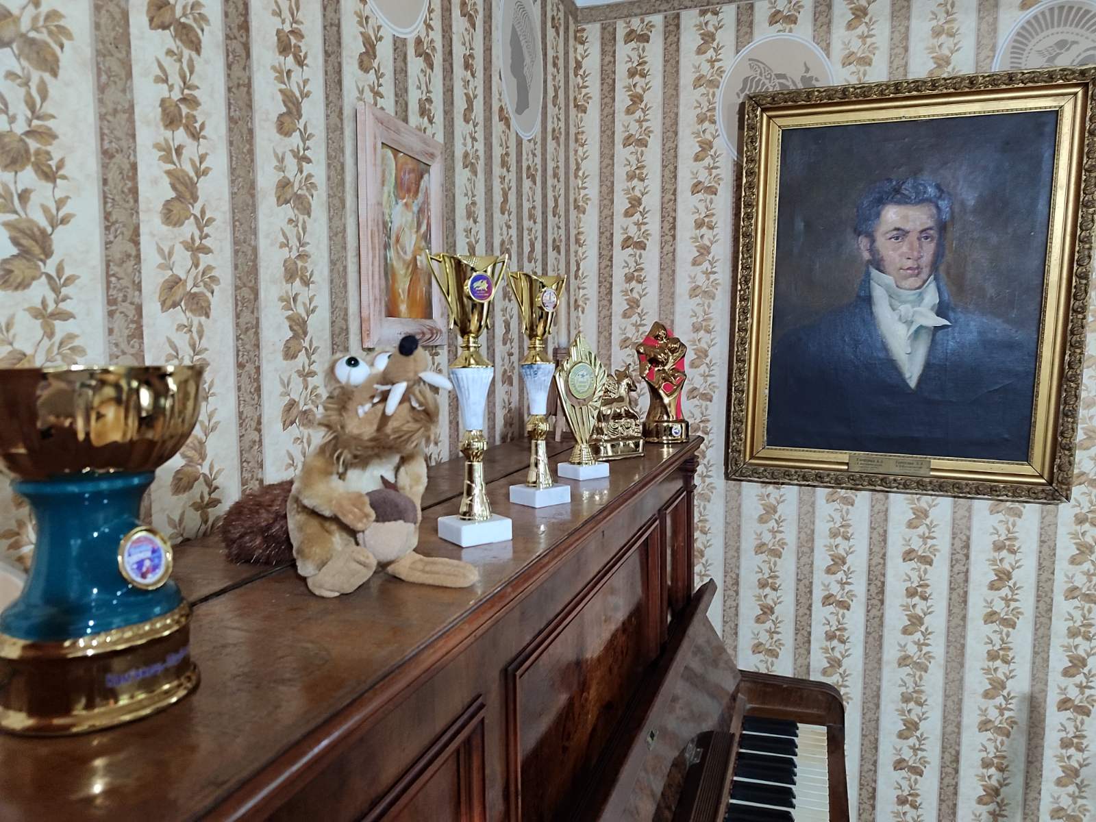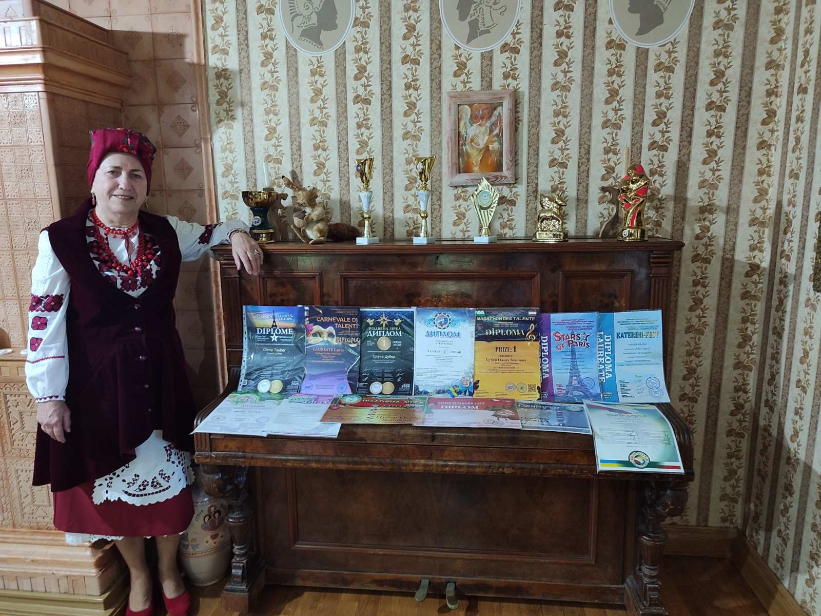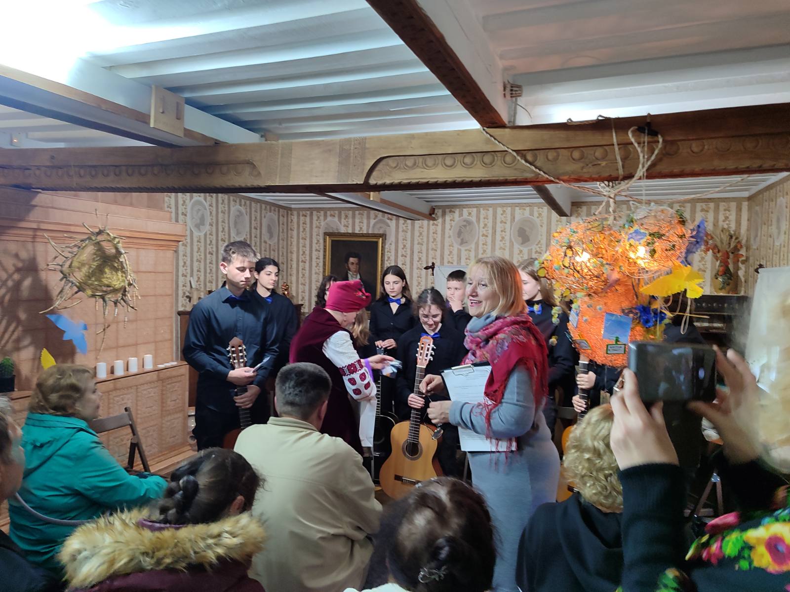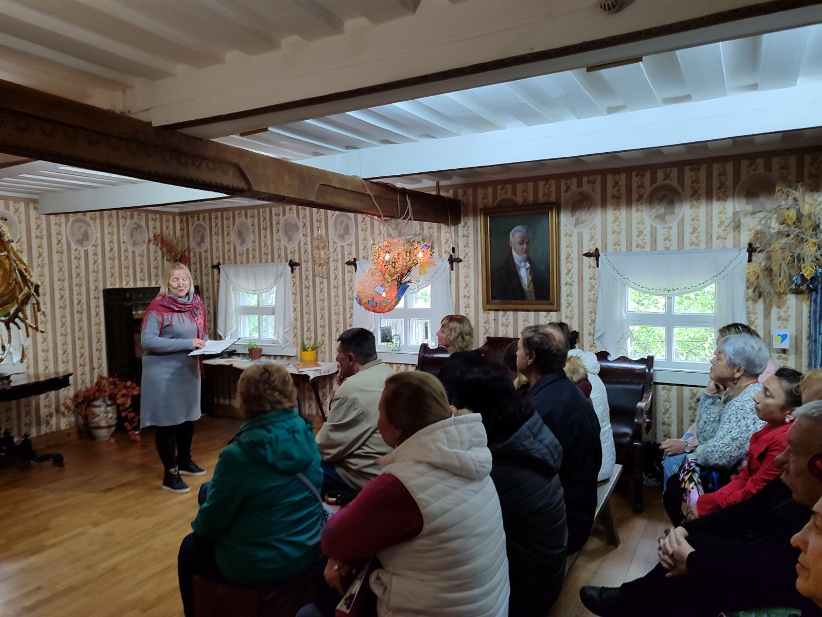 Наукова співробітниця музею Лариса Лобінцева провела пізнавальну розповідь про згадки Івана Котляревського за кордоном і вплив його творчості на європейську культуру. Особливу увагу учасників заходу привернув виступ Олени Цубер — полтавки, яка активно популяризує творчість Котляревського на міжнародному рівні. Вона декламує уривки з «Енеїди», бере участь у численних онлайн-конкурсах за кордоном, а також власноруч створює колоритні українські костюми для своїх відео. Олена Іванівна — не лише декламаторка та волонтерка, а й майстриня з вишивки та гачкування, мистецтво яких успадкувала від матері. Вона вишиває ікони, пейзажі, бере участь у регіональних проєктах, створює маскувальні сітки та обереги для військових, а також активно танцює в ансамблях «Полонез» та «Панянка». Її роботи — справжні обереги, а життя — приклад натхнення, любові до України та творчої самореалізації. Пані Олена передала музею кубки та грамоти, здобуті в міжнародних конкурсах, де представляла спадщину Котляревського. Крім того, подарувала учасникам заходу ляльки-мотанки Оранти, виготовлені власноруч, — як обереги добра і сили.