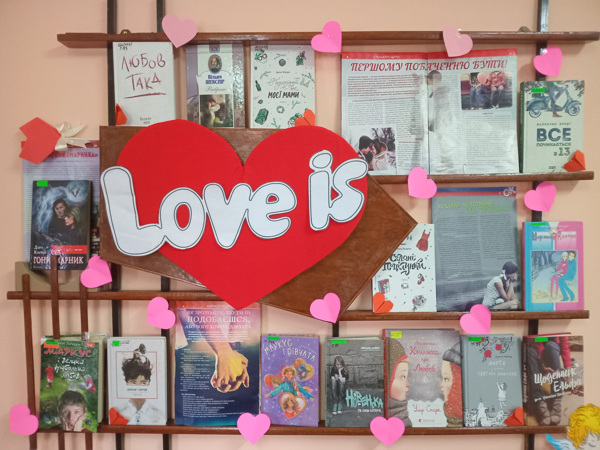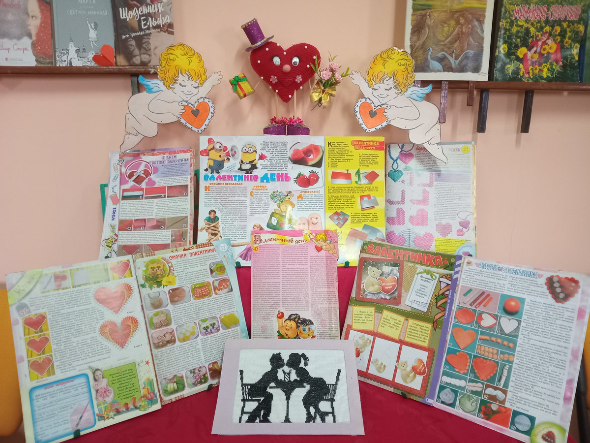 Спеціально до свята бібліотекарі підготували книжкову полицю з художньою літературою про перше кохання, й журналами, у яких можна знайти цікаві ідеї з виготовлення оригінальних подарунків власноруч.