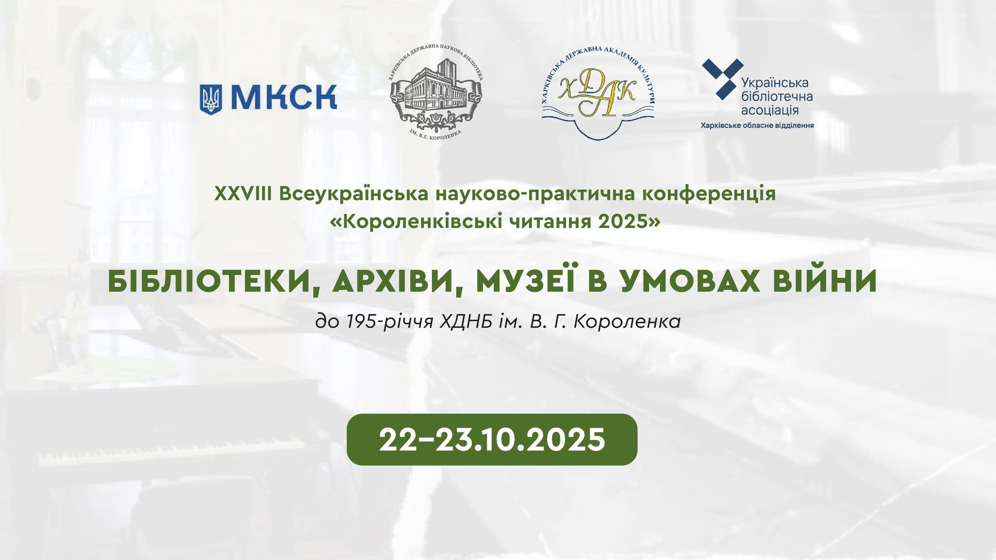 22–23 жовтня 2025 року у незламному Харкові відбулася ХХVІІІ Всеукраїнська онлайнова науково-практична конференція «Короленківські читання 2025.Бібліотеки, архіви, музеї в умовах війни». Цього року вона була присвячена круглій даті -195-річчю Харківської державної наукової бібліотеки імені В. Г. Короленка.
