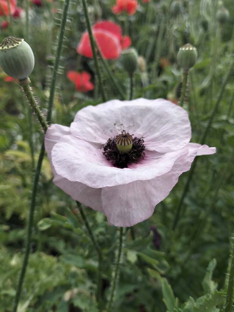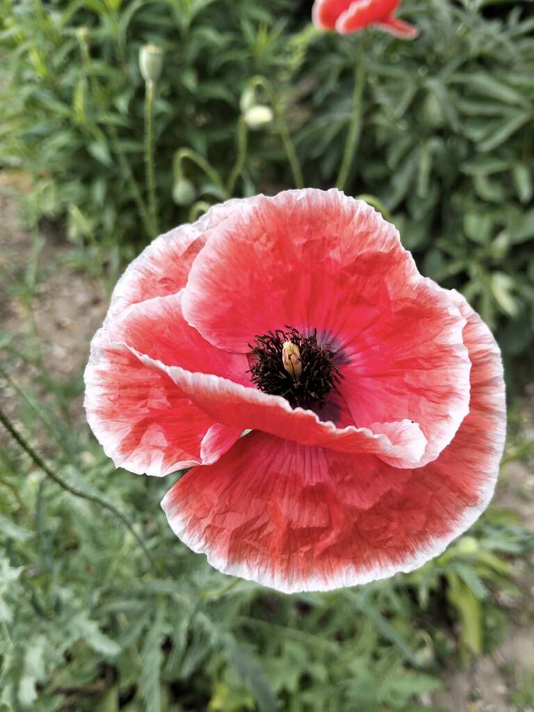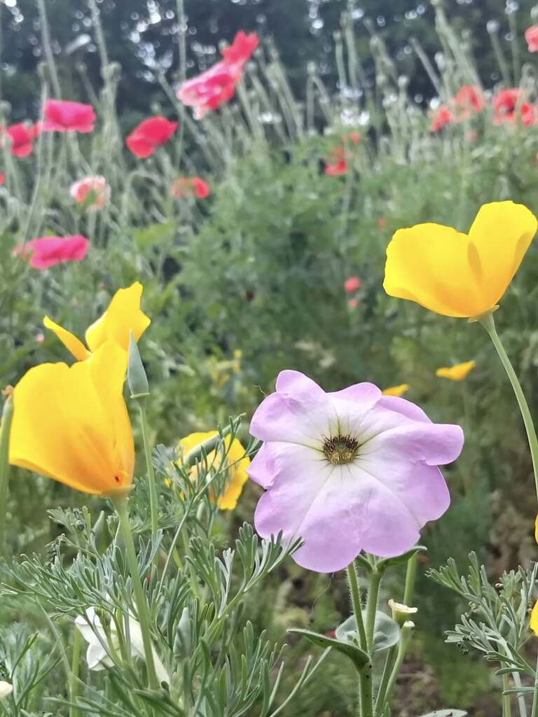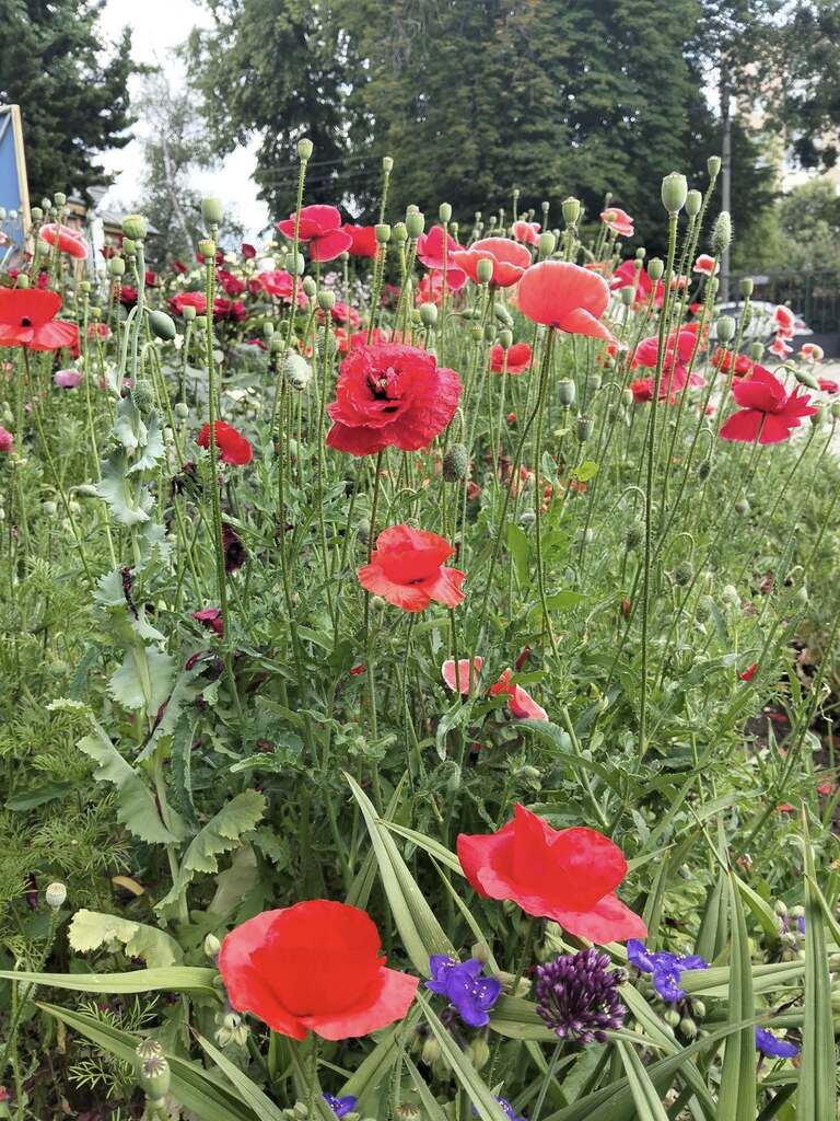 Поряд з ними майорять яскраві маки – червоні, рожеві, з цікавими білими облямівками, створюючи мальовничі килими. А десь серед зелені можна помітити і бузкові петунії, що додають палітрі кольорів ще більше розмаїття.