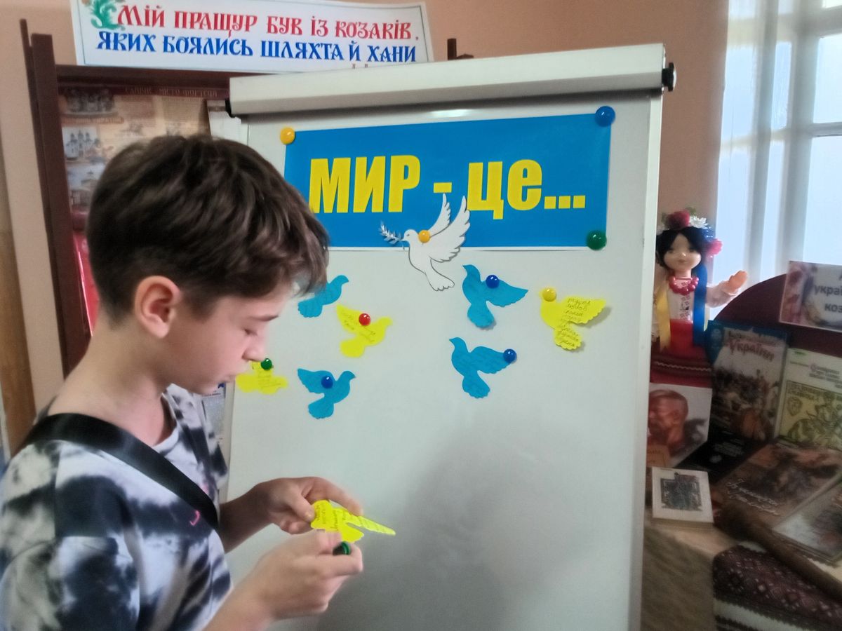 Потім діти змагалися командами: відповідали на запитання: «Які асоціації у вас викликає слово «мир»? Відповіді вони написали на паперових голубах та прикріпили на фліпчарт.