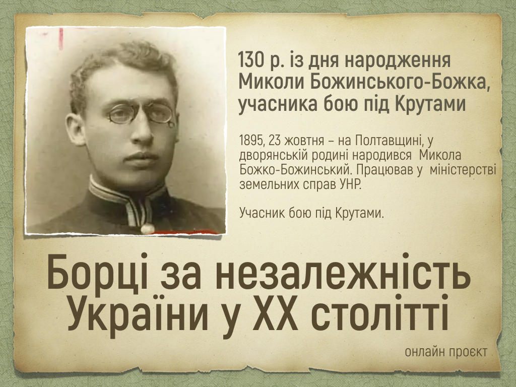 Онлайн проєкт "Борці за незалежність України у ХХ столітті": 130 років із дня народження Миколи Божинського-Божка, учасника бою під Крутами