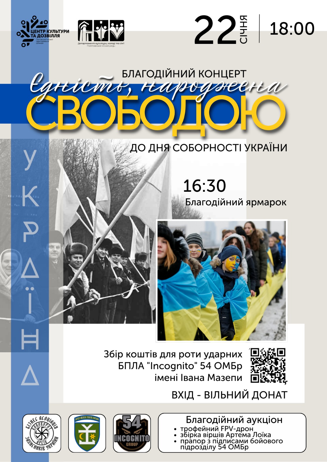 Полтава відзначатиме День Соборності благодійним концертом: збір коштів на дрони для роти «Incognito»