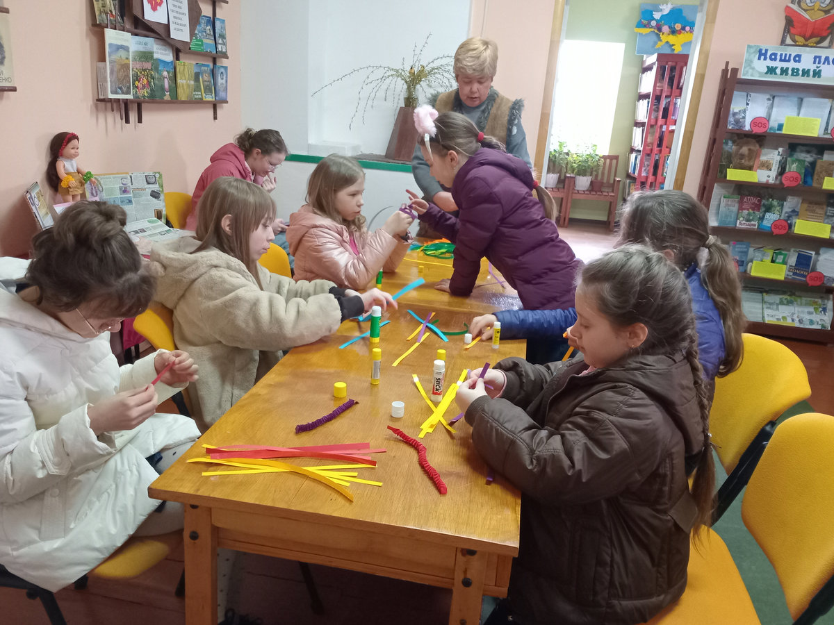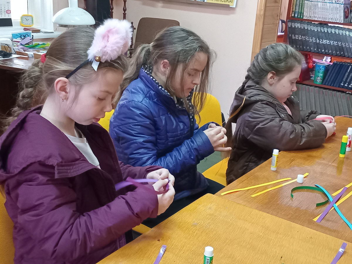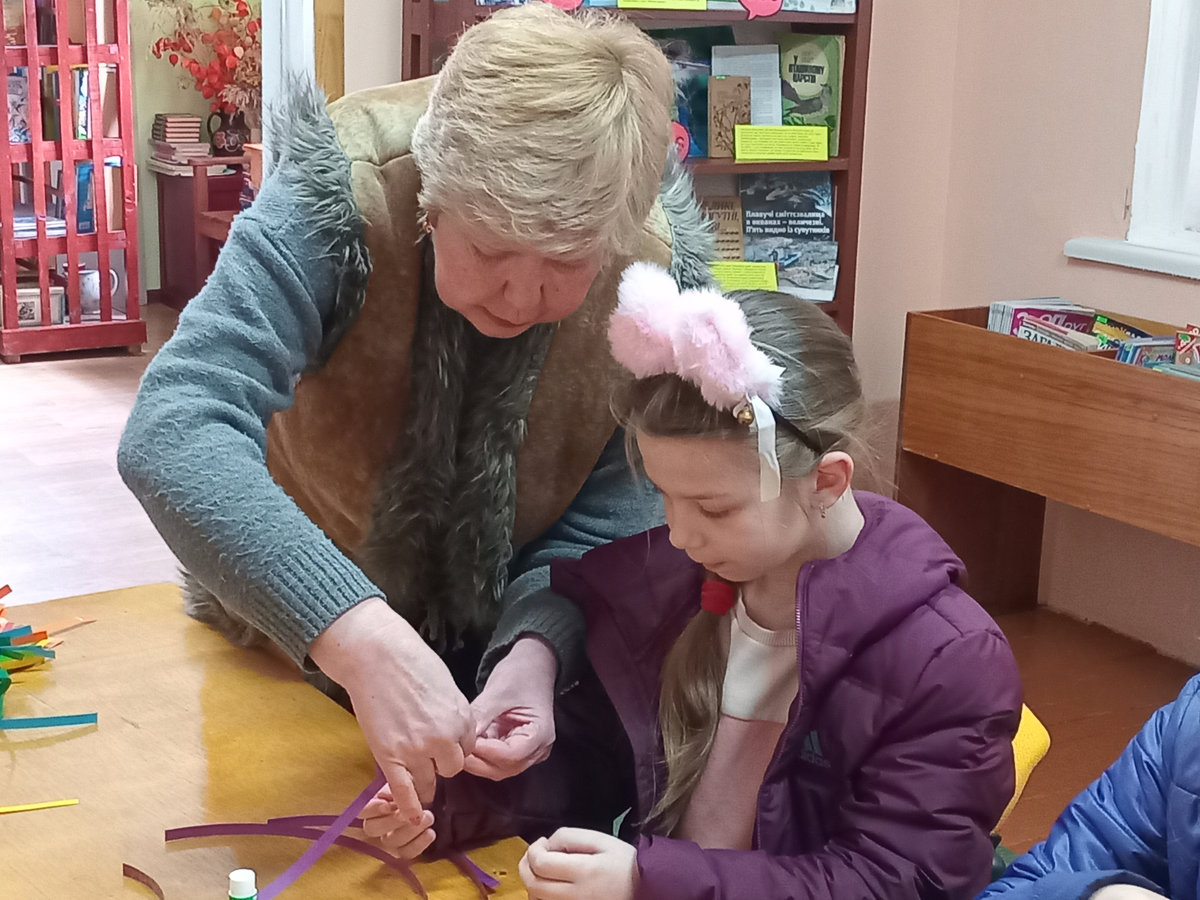 Під наставництвом бібліотекарки Світлани Городинської готові вироби вийшли доволі симпатичними. Для міцності готового виробу, аркуші кольорового паперу проклеїли з одного боку скотчем, а потім із них нарізали смужки шириною 1 см. Після цього смужки потрібно було акуратно скласти, міцно притискаючи лінії згину. Ця вправа дуже добре розвиває дрібну моторику й уважність.