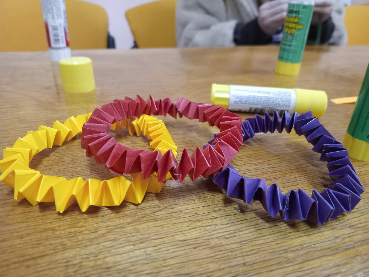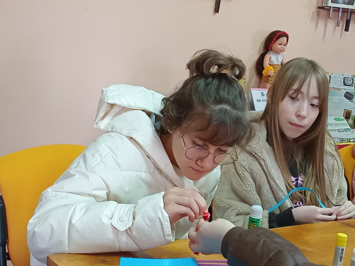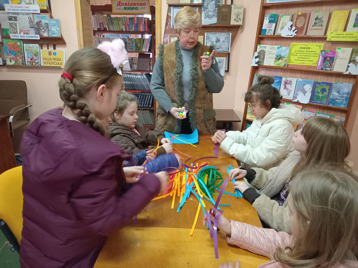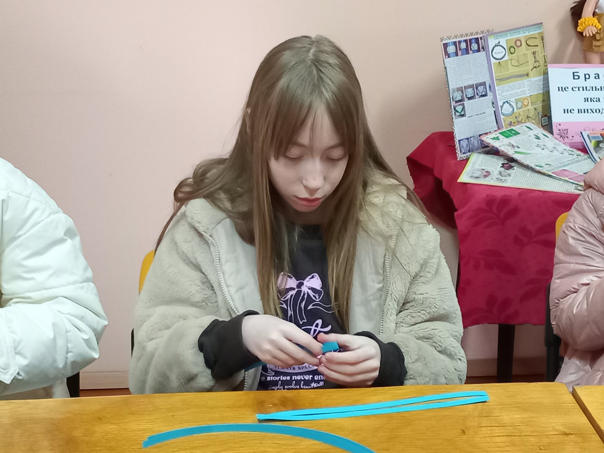 Під наставництвом бібліотекарки Світлани Городинської готові вироби вийшли доволі симпатичними. Для міцності готового виробу, аркуші кольорового паперу проклеїли з одного боку скотчем, а потім із них нарізали смужки шириною 1 см. Після цього смужки потрібно було акуратно скласти, міцно притискаючи лінії згину. Ця вправа дуже добре розвиває дрібну моторику й уважність.