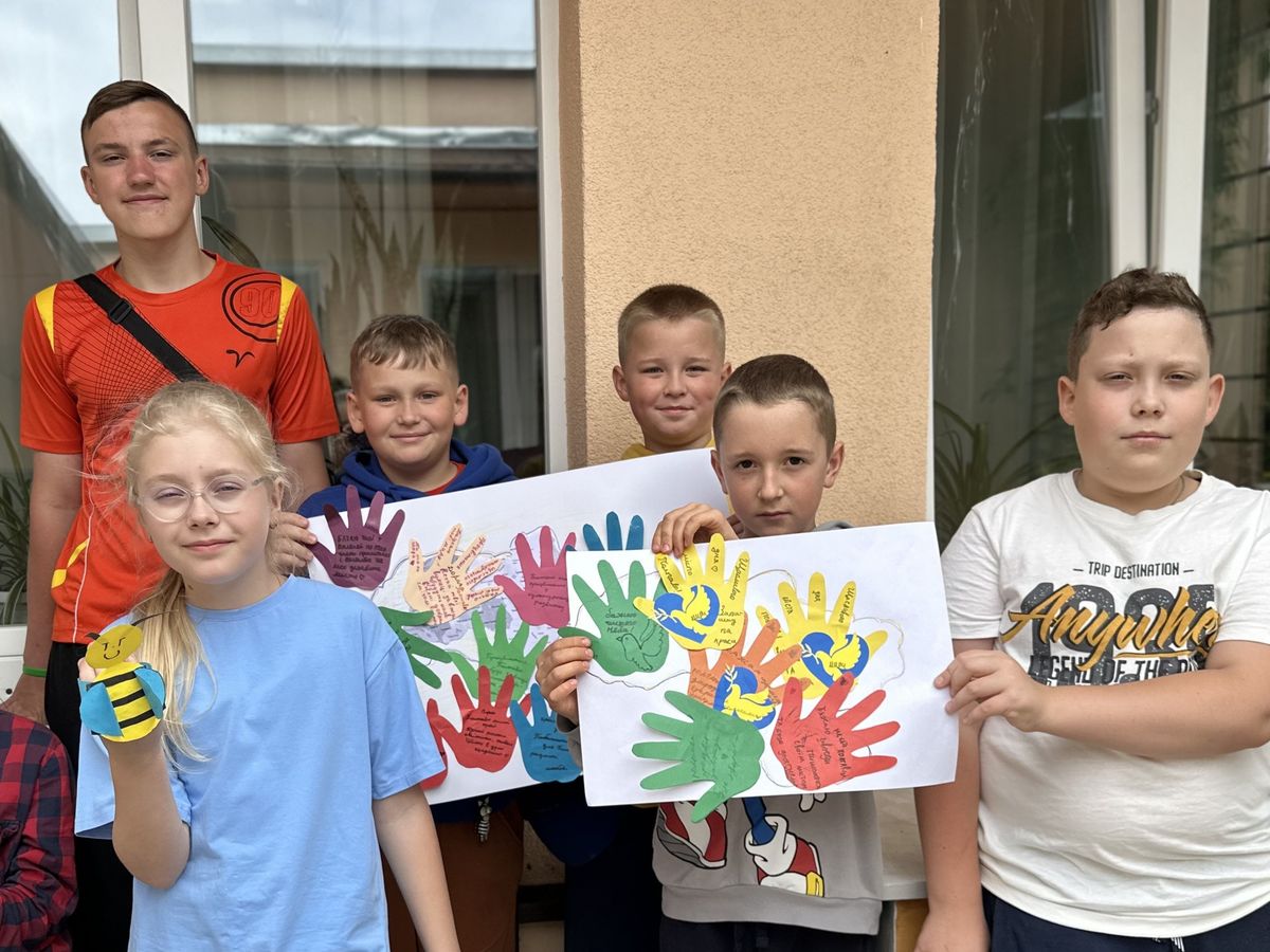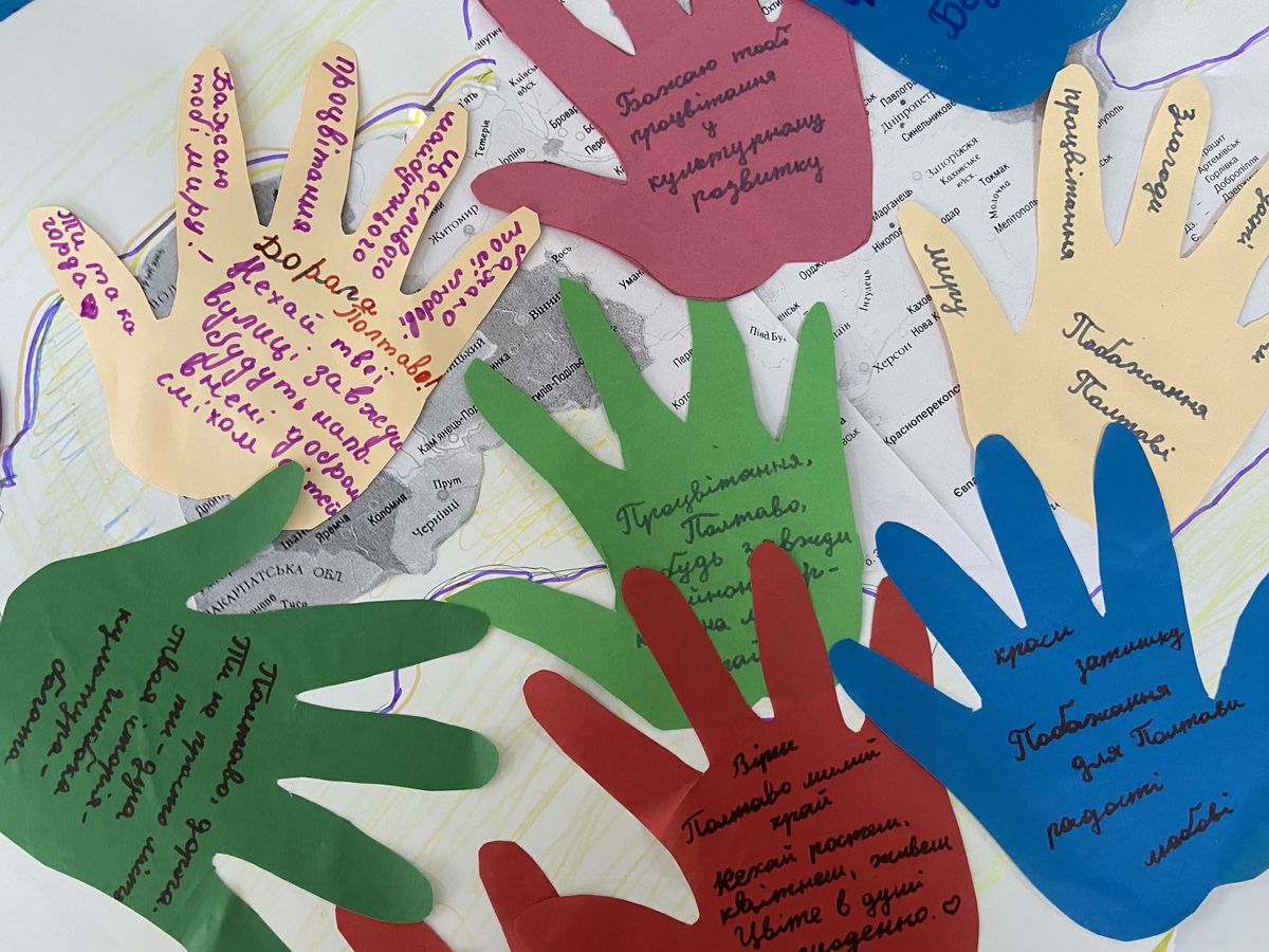 Маленькі учасники з натхненням долучилися до створення листівок-долоньок з побажаннями для рідної Полтави. Ці кольорові долоньки утворили велике символічне серце на мапі України — зворушлива акція, яка надовго залишиться в пам’яті.