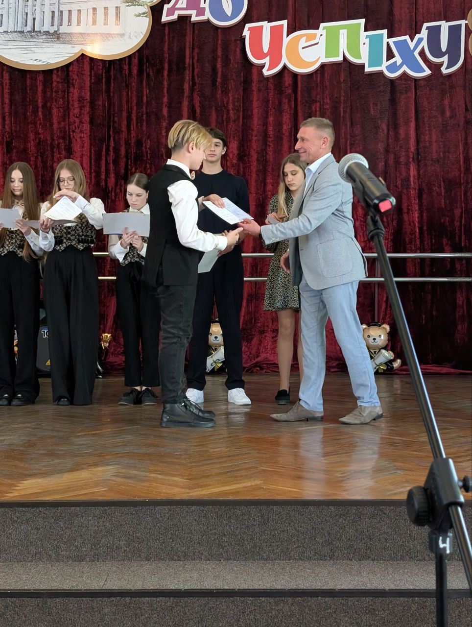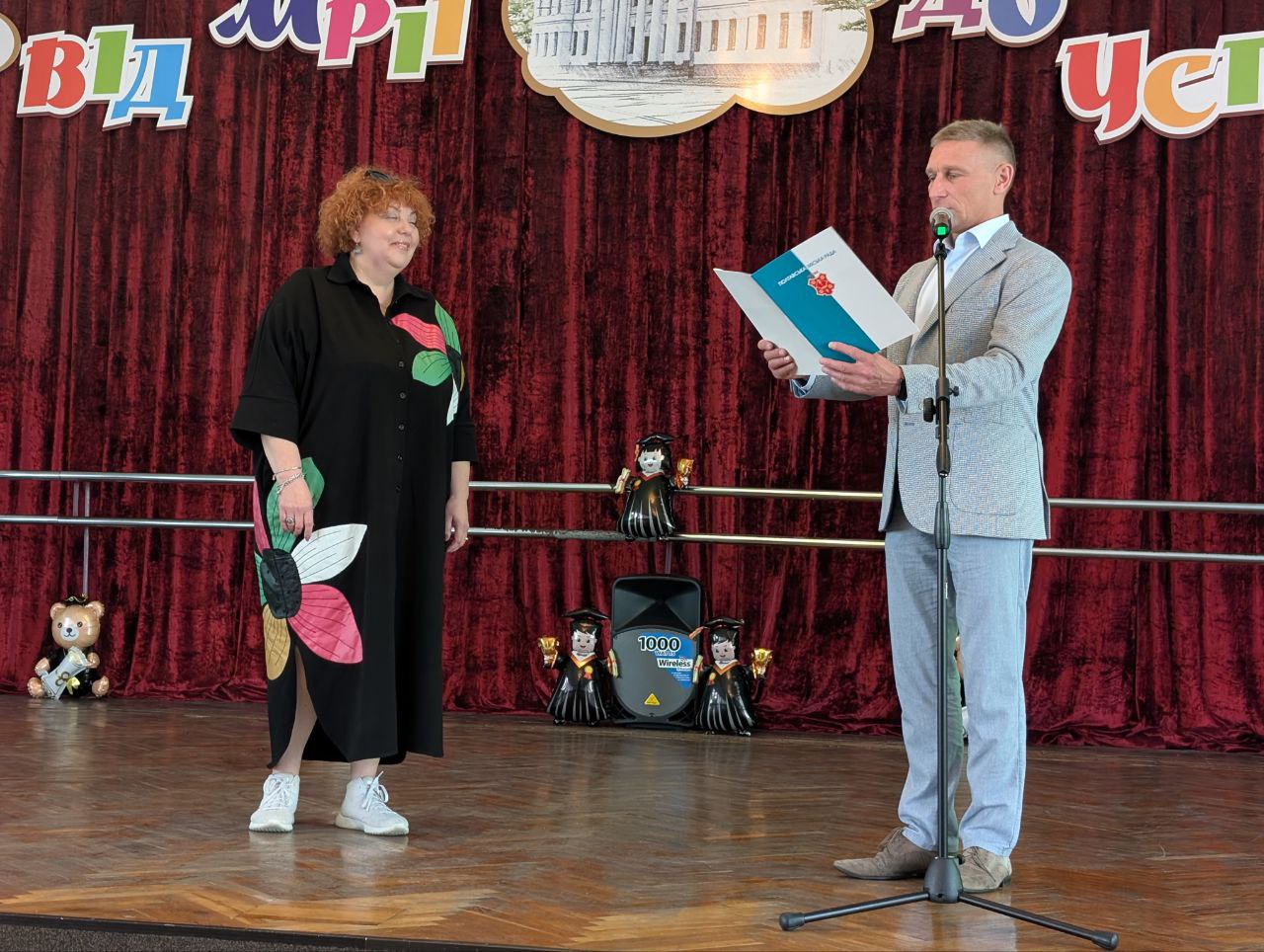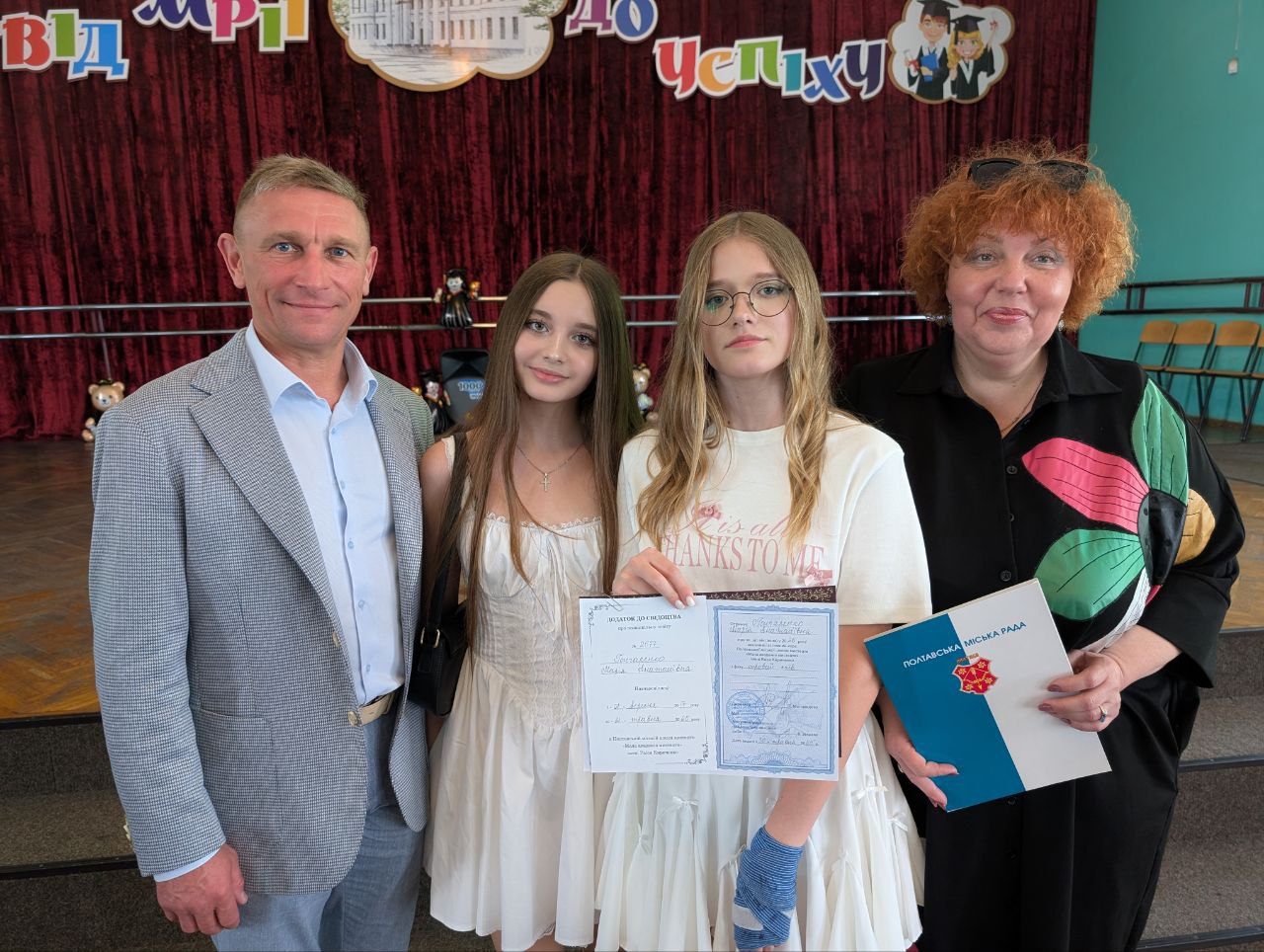 Особливу атмосферу створили привітання від першого заступника міського голови — Валерія Пархоменка. Його щирі слова стали важливим акцентом цього дня, сповненого пам’яті, гордості та надій. Кожен випускник отримав своє свідоцтво саме з рук Валерія Пархоменка — з усмішкою, увагою й тією щирістю, яку неможливо підробити. Цей момент став не просто формальністю, а справжнім символом визнання і натхнення на майбутнє.