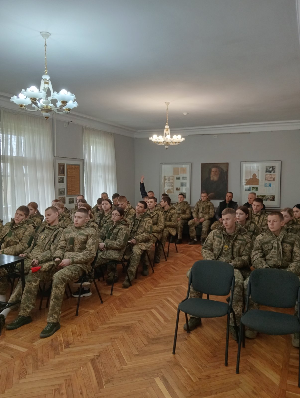 Під час бесіди Олександр розповів майбутнім військовим про свій шлях від волонтерства до війська, а потім – через важке поранення – до творчості. Своїм життєвим кредо він обрав патріотизм і оптимізм, що й допомагало йому у тяжких життєвих ситуаціях. Також Олександр поділився цікавими епізодами зі свого бойового досвіду і провів ліцеїстам своєрідне «тестування на боєздатність». І у цьому тестуванні переміг гуманізм, що особливо значуще в домі видатного гуманіста Короленка, котрий вважав, що зі злом треба боротися будь-якими засобами, у тому числі і зі зброєю в руках.