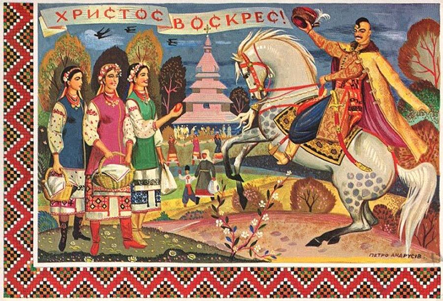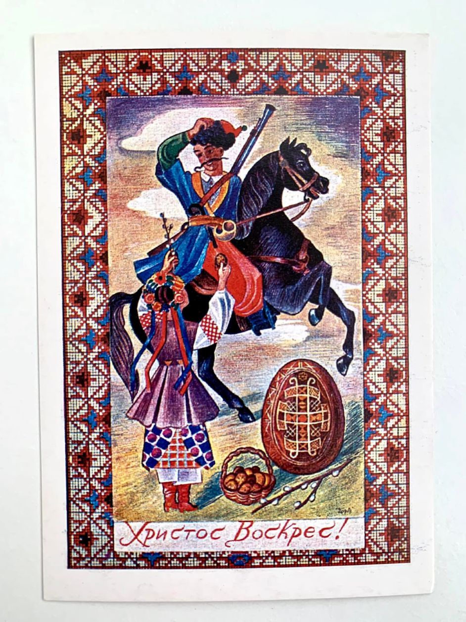 В оформленні Великодніх листівок початку – середини ХХ ст. зображення найрізноманітніших народних обрядів і атрибутів часто поєднували з державною символікою. Типовим для них є напис «Христос Воскрес – воскресне Україна» і образ козака, як уособлення народного героя-переможця.