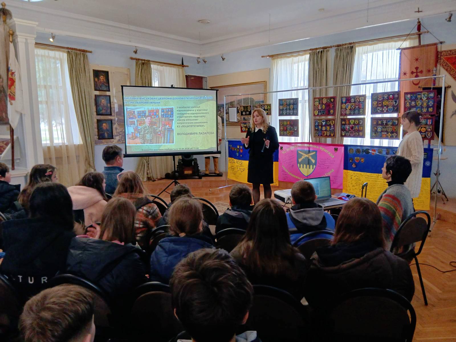 Особливу зацікавленість у дітей викликав виступ самого колекціонера військових шевронів Володимира Лазарєва, який змістовно й доступно розповів про власне зібрання, що дало змогу учням краще відчути атмосферу тих подій та усвідомити їх значення. Колекція включає шеврони початкового періоду Операції: оперативно-тактичного угрупування «Маріуполь», «Донецьк», «Луганськ», шеврони добровольчих батальйонів «Азов», «Айдар», «Донбас», окремих добровольчих батальйонів областей України.